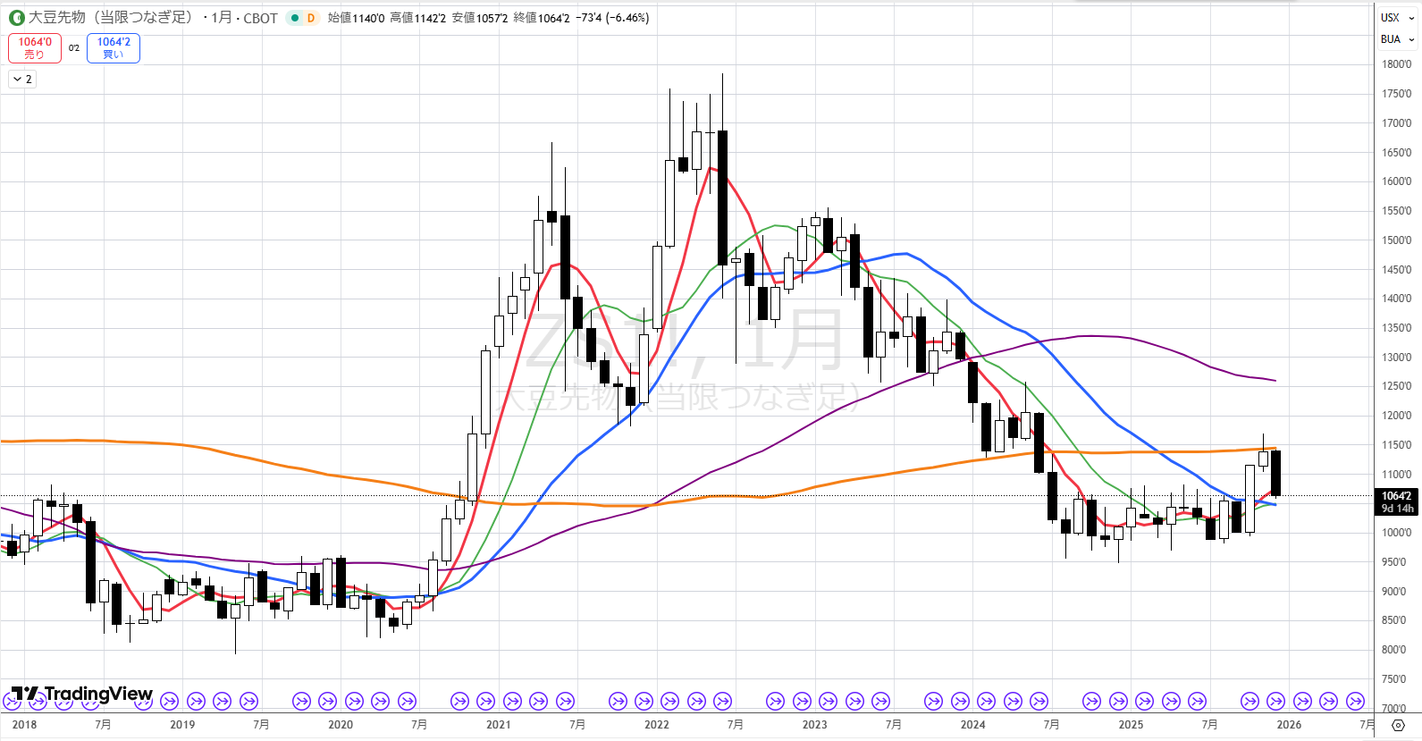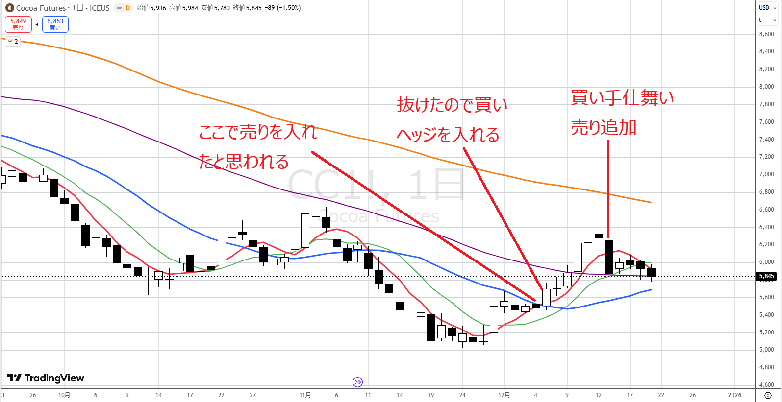 ココアですが、青に当たったところで打診売りをしたら、あっさり紫を超えていきました。週足青が日足のオレンジなので、そこまでは一旦上げるかもと思っています。買いヘッジを入れてしのぐ作戦でよいでしょうか?