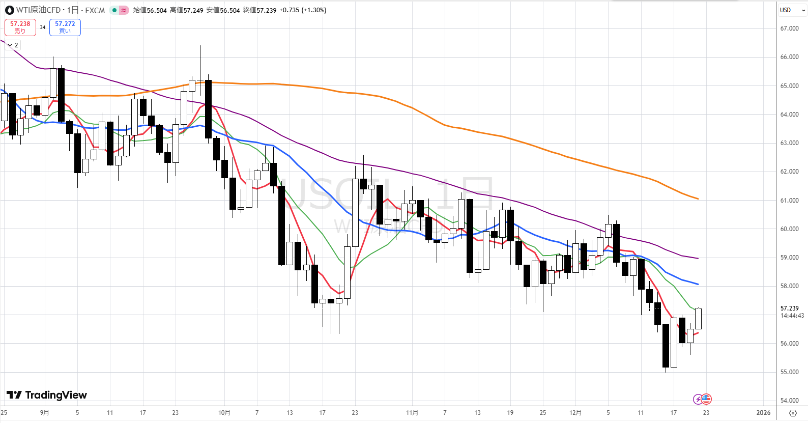 原油が買いではない理由は、日足、週足においてすべての移動平均線が下を向いているからです。