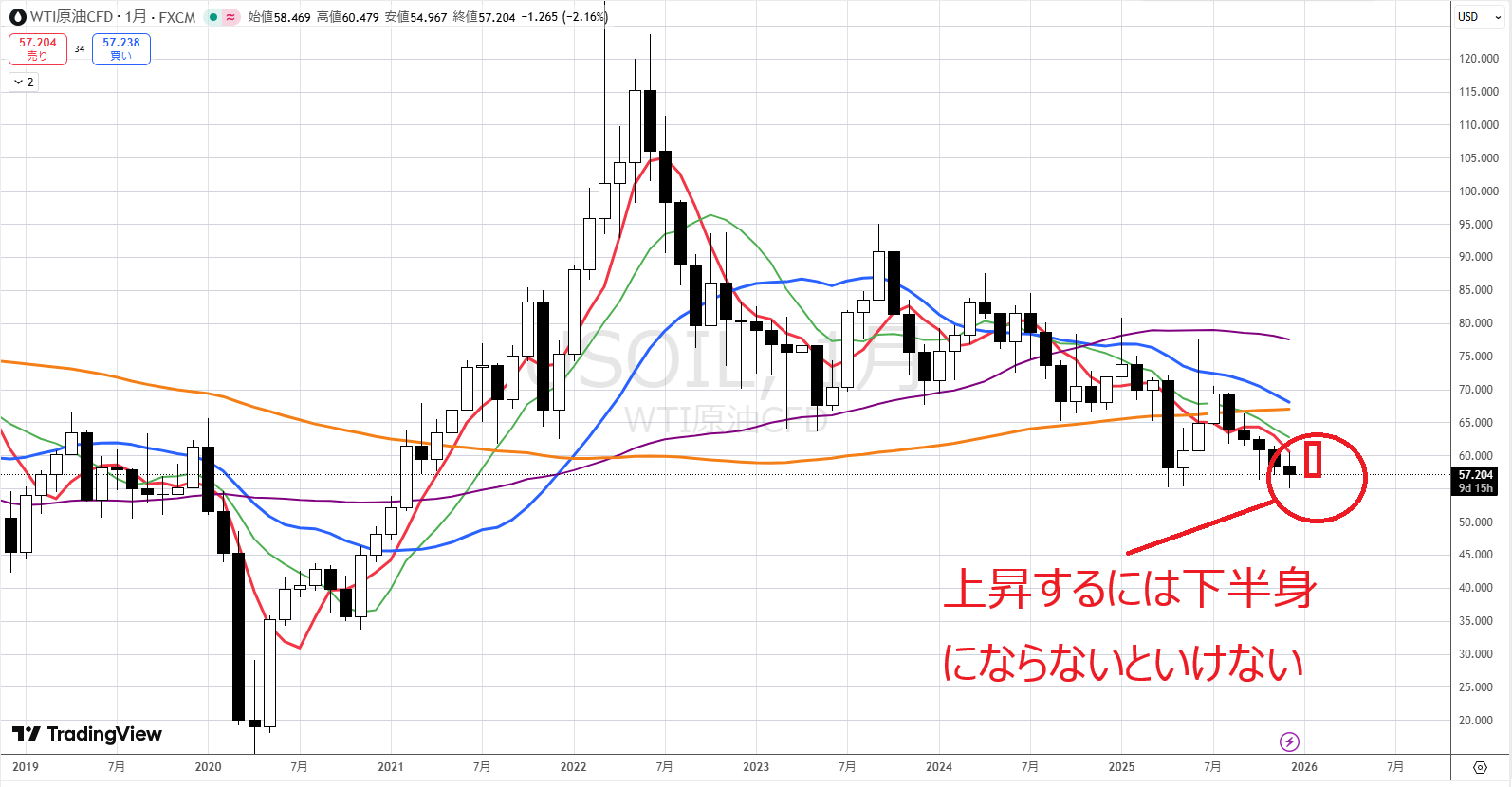 原油が上昇に転じるためには、月足で下半身になる必要がありますので、売り主体で行く必要があります。