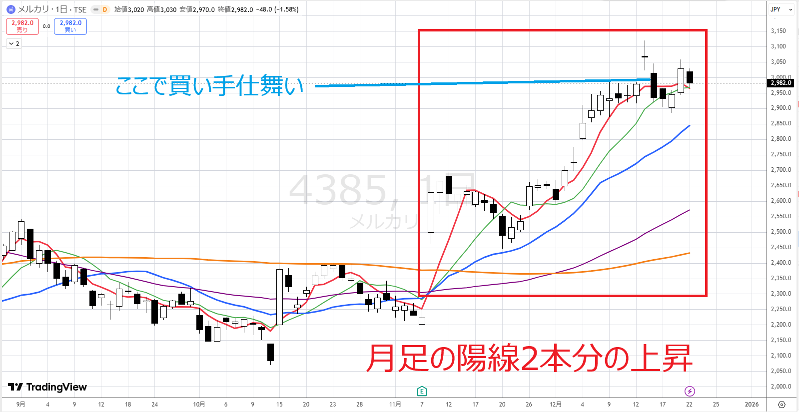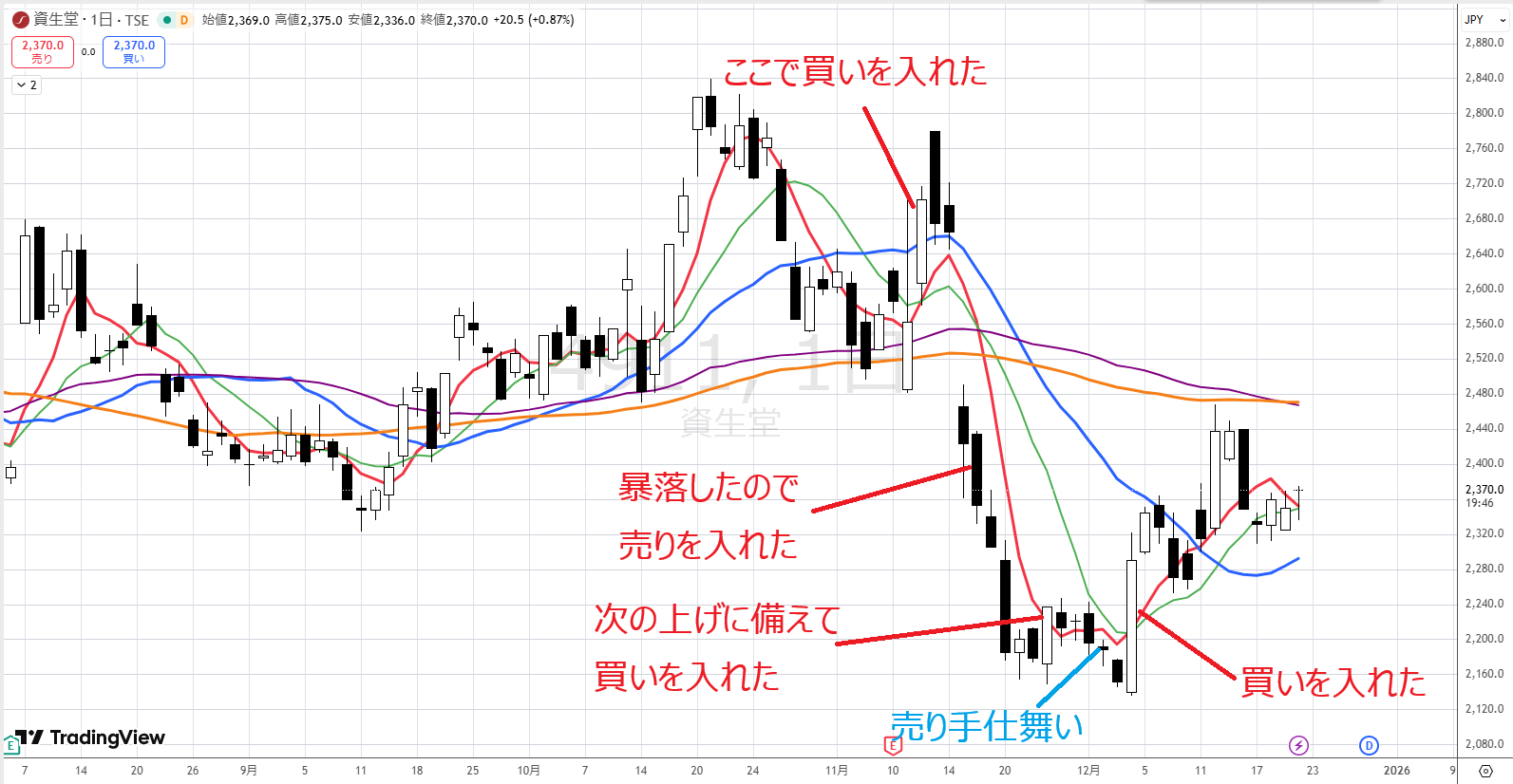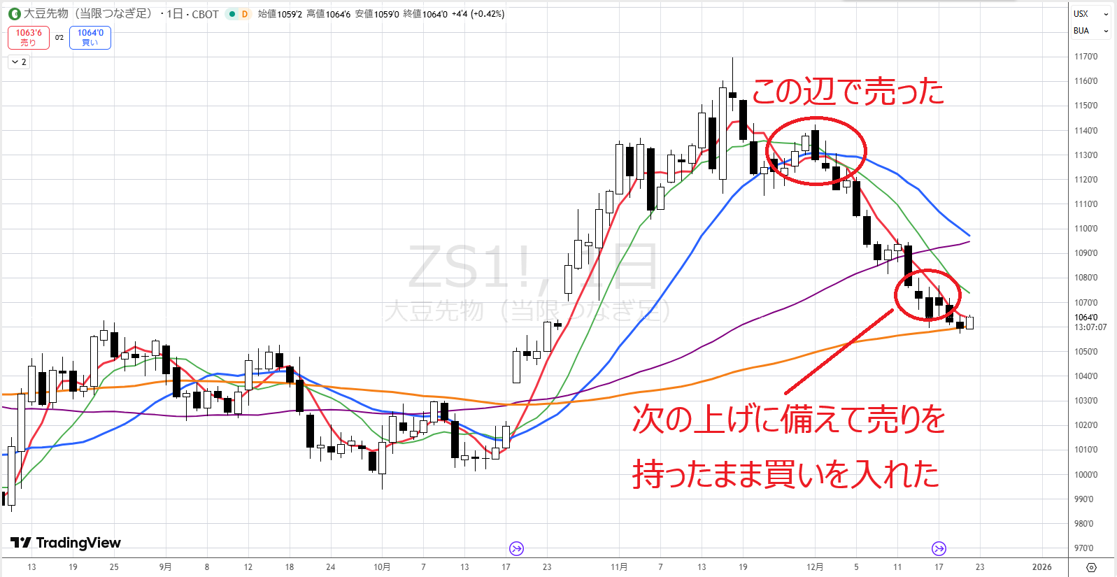 その後、下げ止まり感が出てきたときに、次の上げに備えて買いを追加しました。