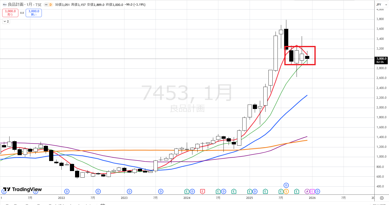 さらに月足では、天井をつけてオレンジを割りこみ、その後、オレンジまで上げたけど再び下げました。