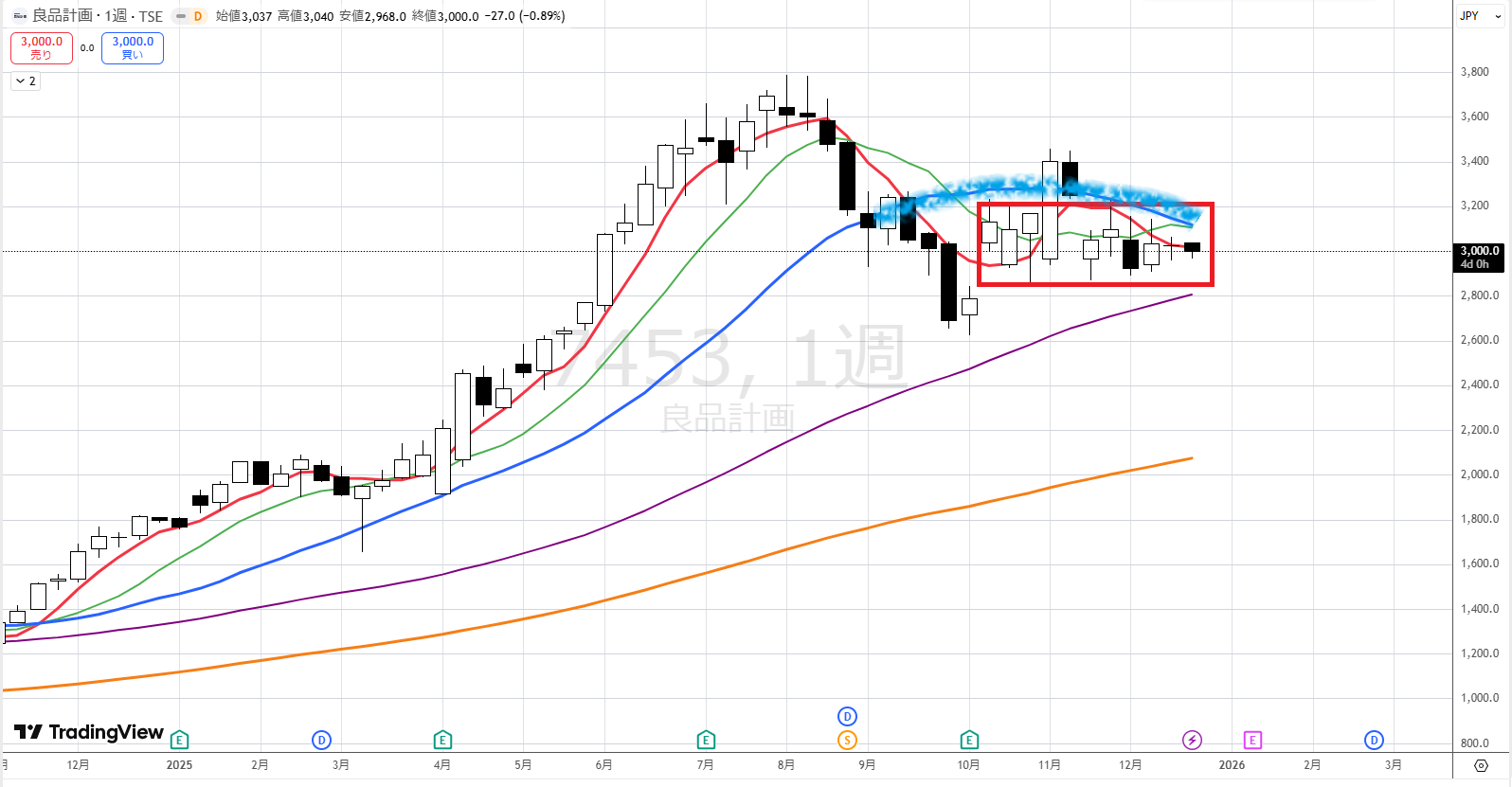 週足を見ると、横に動いて見えます。それと青が丸まってきています。青が丸まるとボックスになるということは、株塾勉強会でもこの番組や本でも紹介してきました。