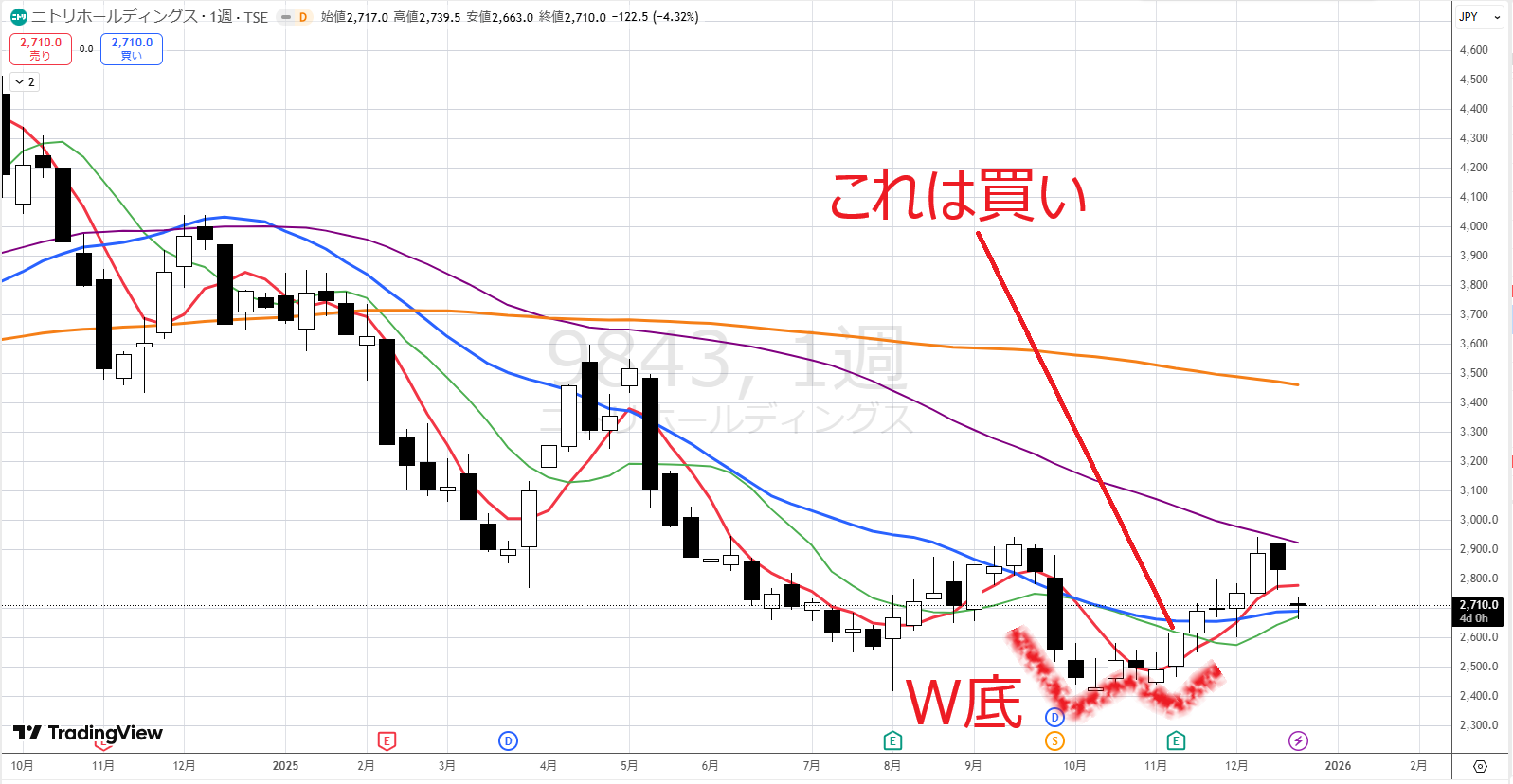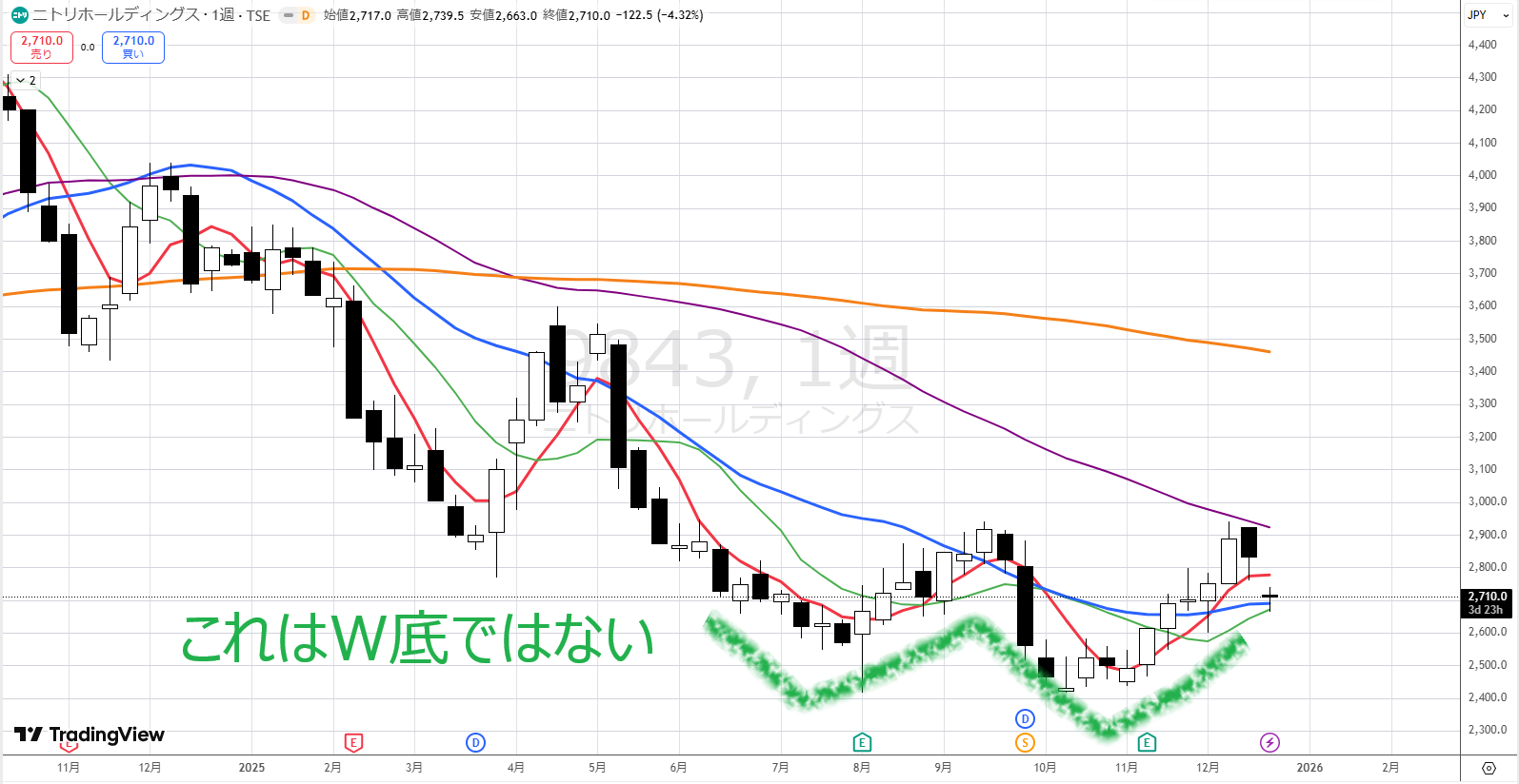 9843ニトリを11月21日の下半身を見て、25日の寄り付きで買いエントリーしました。週足はMAでみるとW底にはなっていないのですが、ロウソク足で見るとW底になっているように見えます。これはW底といってよいでしょうか?