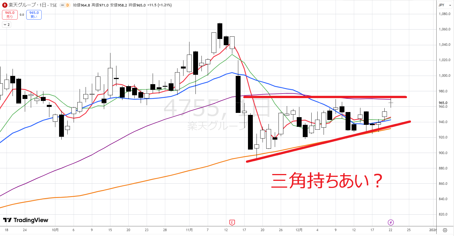 先週は楽天G取り上げていただいてありがとうございました。12月8日に陰線が出たので翌日に手仕舞いました。本日12月11日にかなり下げましたので、損が少なくて済みました。