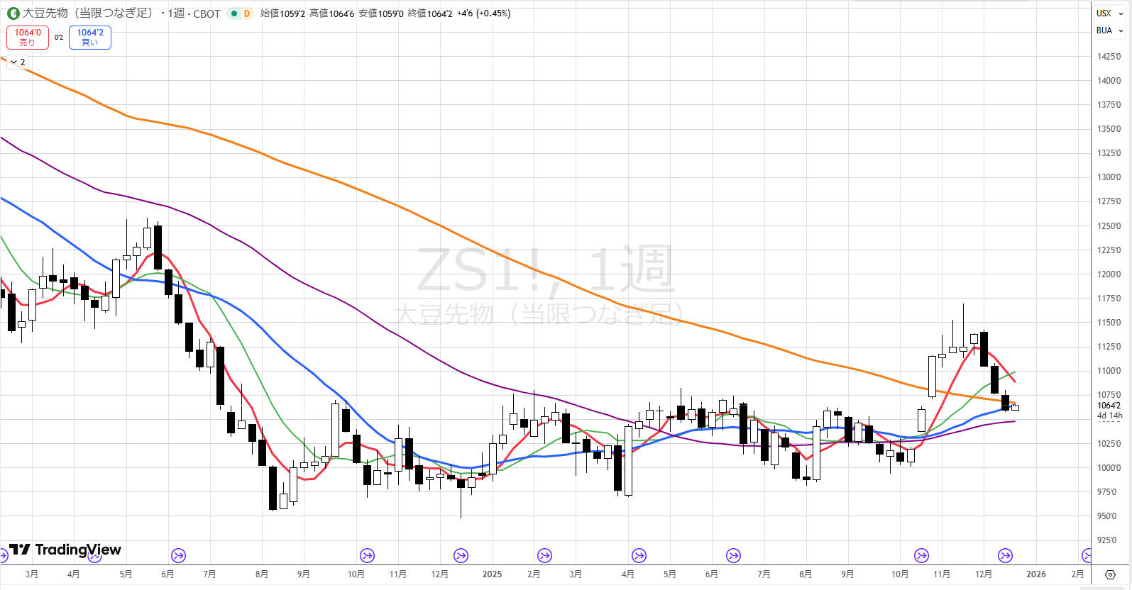 週足ではオレンジを超えて、今はオレンジまで下げています。紫と青は上を向いています。