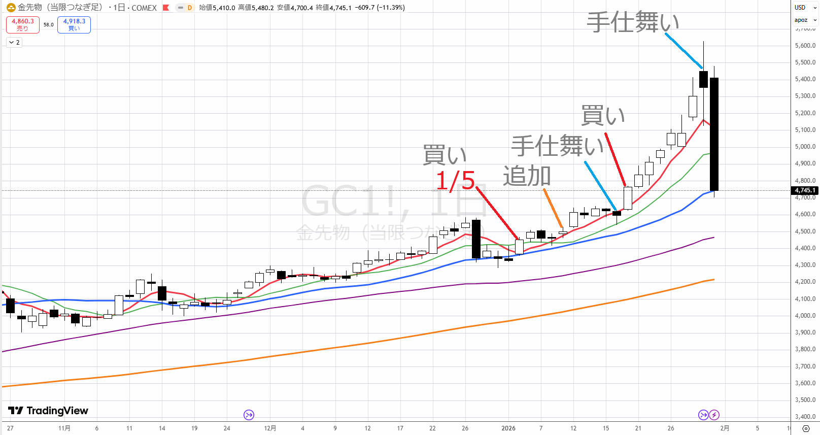 先ほどのゴールドは手仕舞わなかったですが、ゴールドとはエリアが違います。ゴールドは上昇力が強いパンパカパンのエリアでした。